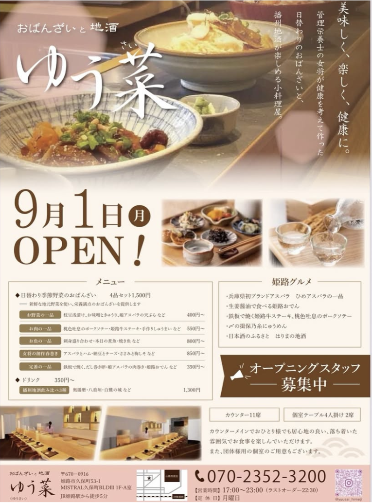 9月1日に❕ 姫路市久保町に「おばんざいと地酒 ゆう菜」さんが